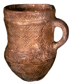 Hand made small mug or beaker with scratched zig-zag patterns. "Beaker Folk", England ca.2000 BC ht:15cm.BM