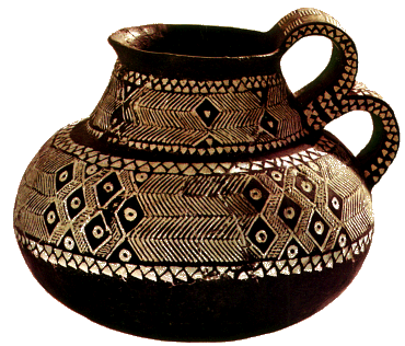 Shiny black pottery jug, incised decoration filled with white slip. ht:10cm. ca.700 BC. Hallstatt culture Bavaria, Germany PSM.