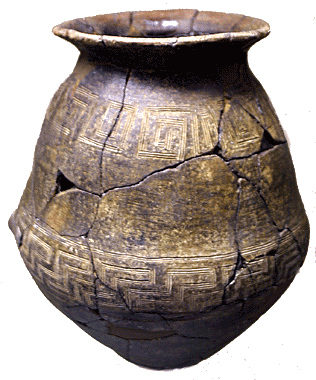 Large cone-shaped pot with outward turned lip. Incised and impressed ornamentation, parts blackened with graphite. ht:26cm ca.700 BC Hallstatt culture .Baden-Württemburg, Germany. WLS.